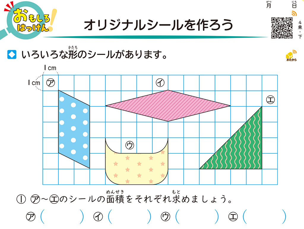 本時では、「おもしろい発見がいっぱい!算数ドリル」4年下(東京書籍版)の[オリジナルシールを作ろう]の問題を基にして授業を構成・展開していきました。