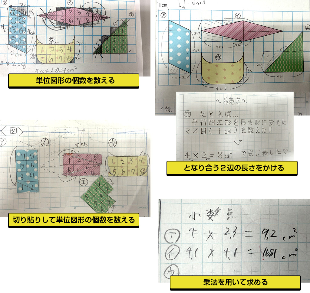 作図の際には、この部分とこの部分を組み合わせると1cm²になるといったことを意識し、単位図形がいくつ分になるかを考えながら図形を構成しようとする様子がうかがえました。