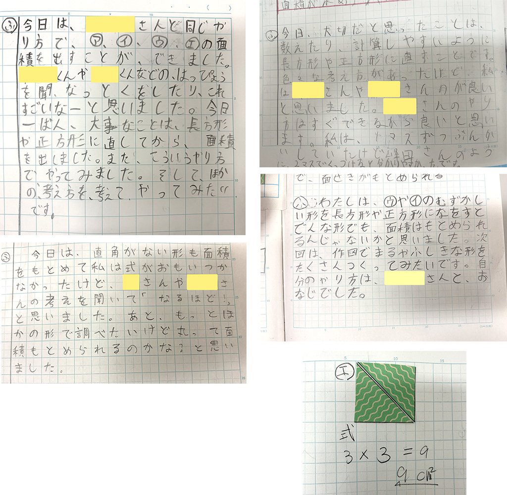 これは、辺の長さだけでなく、図形の広がりそのものを量として捉える見方を育てることにつながるものであると考えられます。このように、児童一人ひとりが自分なりの方法で問題解決に取り組む中で、図形を構成する要素や性質に着目して捉えたり、既習の図形に帰着させて考えたりするなど、数量や図形についての感覚を豊かにすることができました。