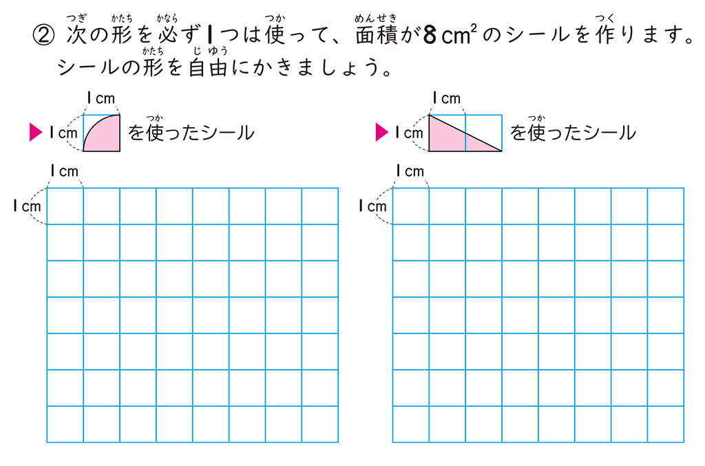 適用問題では、指定された面積のシールを作る活動に取り組みました。シールという文脈を生かしたことで、児童は本時で学習した内容を生かして、意欲的に図形を作成する姿が見られました。