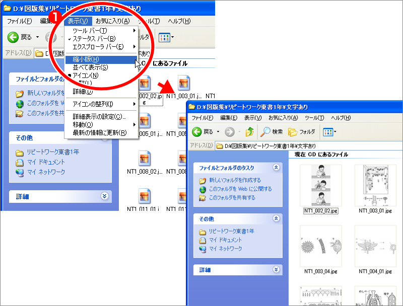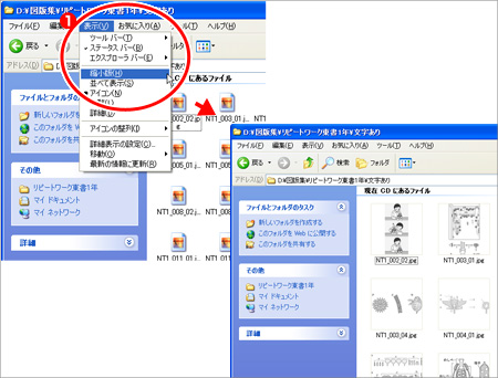 フォルダー上部ツールバー内の「表示」をクリックしてプルダウンメニューの中から「縮小版」を選択すると画像一覧でご覧いただけます。