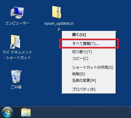 2.保存したZIPファイル [ syuan2023_installer.zip.zip ] を右クリックし、「すべて展開」を選択し、ファイルを任意の場所に展開します。