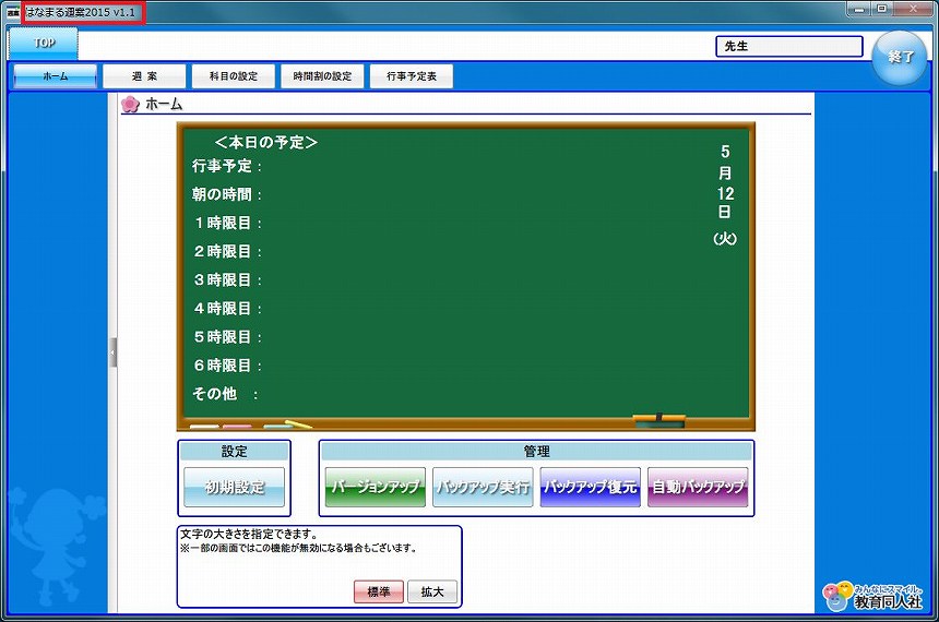 6.はなまる週案の起動後左上のバージョン表示が 「Ver 1.0」 になっていればバージョンアップは完了です。